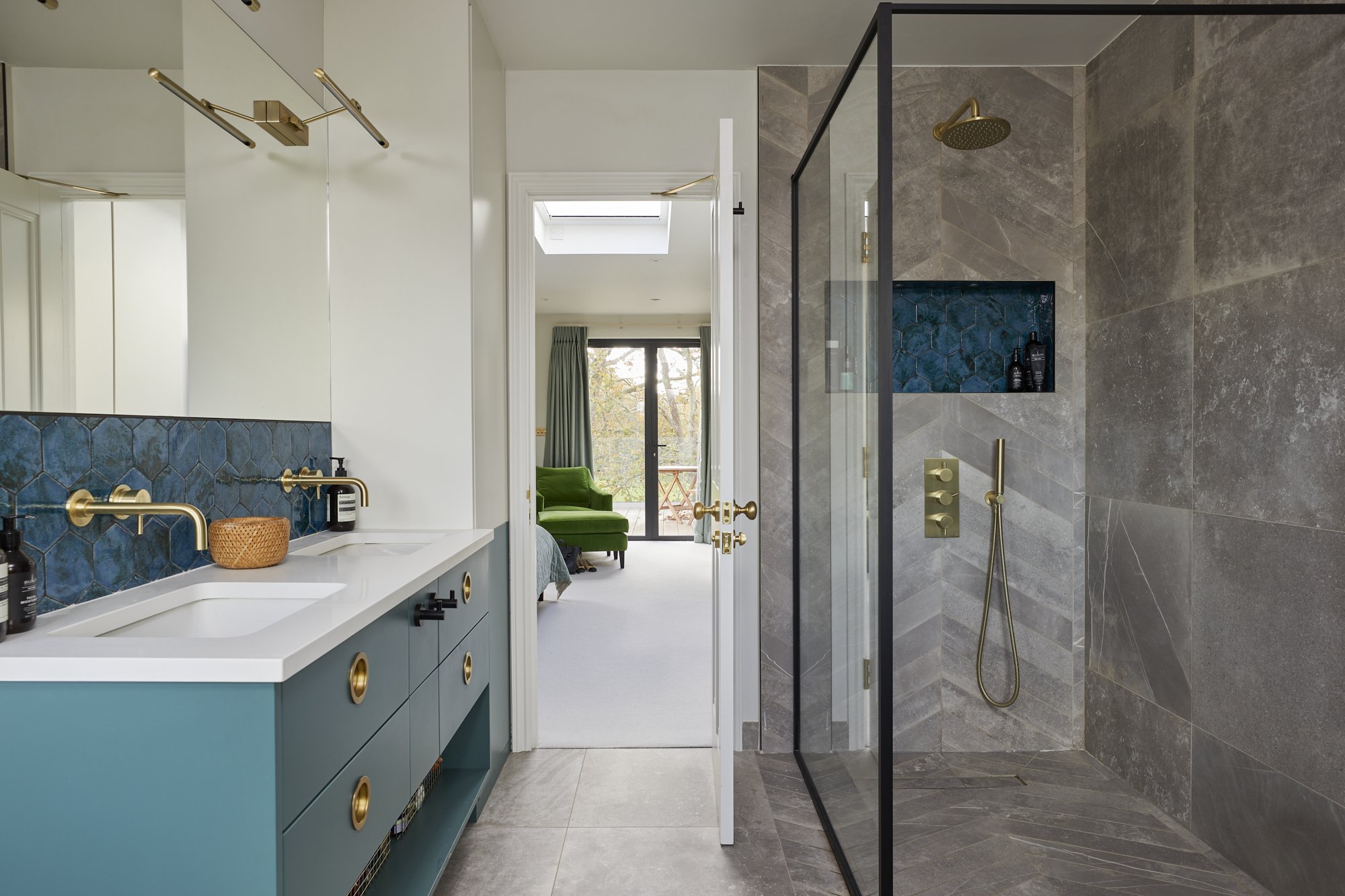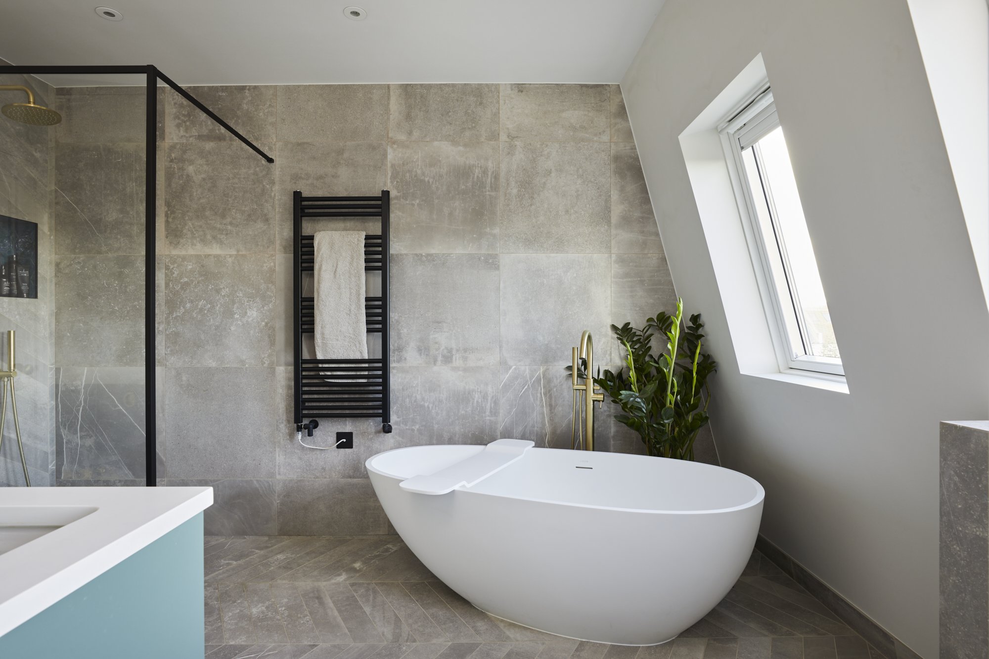 A striking balance between modern sophistication and vintage charm, this bathroom renovation features bold striped tiles that add depth and personality. Sleek contemporary fixtures are complemented by classic details, such as retro-inspired brass accents and timeless vanity design. The result is a space that feels fresh and stylish while nodding to the elegance of the past.